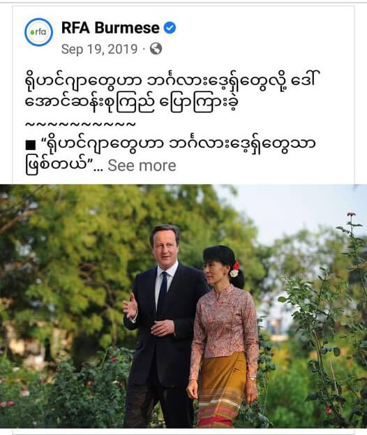 ■ “ရိုဟင်ဂျာတွေဟာ ဘင်္ဂလားဒေ့ရှ်တွေသာ ဖြစ်တယ်” ဆိုပြီး ဒေါ်အောင်ဆန်းစုကြည်က ပြောကြားခဲ့တဲ့အတွက် စိတ်ပျက်ခဲ့ရတယ်လို့ ဗြိတိန်ဝန်ကြီးချုပ်ဟောင်း ဒေးဗစ်ကင်မရွန်းက ရေးသားလိုက်ပါတယ်။