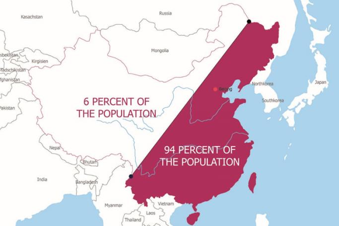 More importantly the meeting of the SCO has important ramifications for Myanmar, particularly as the recently announced China / Myanmar economic corridor was in response to India’s poor reception of China and the BRI. Whilst India’s attendance and participation is noteworthy, Myanmar should not be too concerned about its potential involvement in this ambitious infrastructure project. Whilst it is not a member of the SCO it still provides an important strategic part in China’s ‘go west “programme to redress internal uneven economic development. When looking at the population map of China below, it is evident that Myanmar has a direct border with that part of China that holds 96% of the Chinese population, as well as access to that part of China requiring development and access to markets.