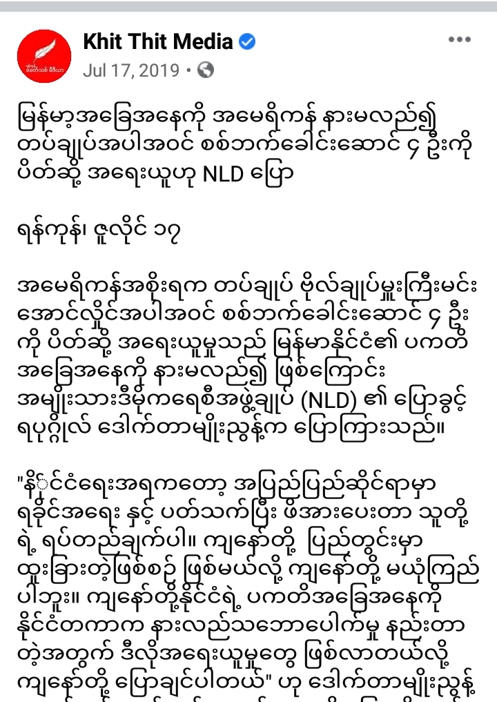 အမေရိကန်အစိုးရက တပ်ချုပ် ဗိုလ်ချုပ်မှူးကြီးမင်းအောင်လှိုင်အပါအ၀င် စစ်ဘက်ခေါင်းဆောင် ၄ ဦး ကို ပိတ်ဆို့ အရေးယူမှုသည် မြန်မာနိုင်ငံ၏ ပကတိအခြေအနေကို နားမလည်၍ ဖြစ်ကြောင်း အမျိုးသားဒီမိုကရေစီအဖွဲ့ချုပ် (NLD) ၏ ပြောခွင့်ရပုဂ္ဂိုလ် ဒေါက်တာမျိုးညွန့်က ပြောကြားသည်။