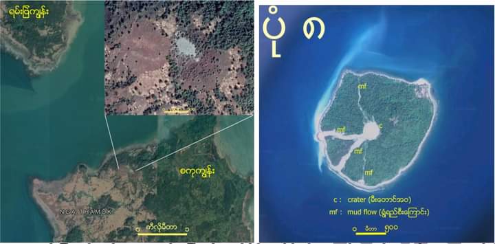 ပုံ ၈။ရမ်းဗြဲကျွန်း နှင့် စကုကျွန်းမြောက်ဘက်ပိုင်းတွင်ရှိရွံ့မီးတောင်(ဘယ်)။ နှင့် နံ့သာကျွန်းရှိရွံ့မီး တောင်၊မီးတောင်အ၀ (c) နှင့် ရွံ့ရည်စီးကြောင်းများ(mf) ကိုဂြိုလ်ထုဓာတ်ပုံမှမြင်ရပုံ။