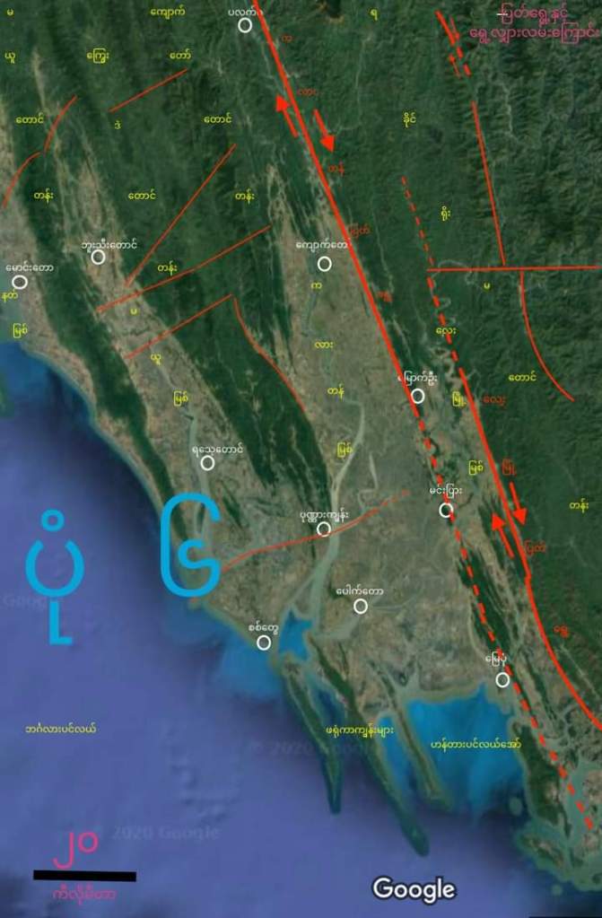 ပုံ ၆။ ဂစ္ဆပနဒီမြစ်ဝကျွန်းပေါ်ဒေသ၏မြစ်ကြီးလေးသွယ်တို့သည် မြစ်ဝကျယ်အဖြစ်ပုံဖွဲ့ပြီး၎င်း (Estuaries)၊ ဟန်းတားပင်လယ်အော်အဖြစ်ပုံဖွဲ့ပြီး၎င်း (Hunter Bay)၊ ဘင်္ဂလားပင်လယ် နှင့်ထိ တွေ့ပေါင်းစပ်စီးဝင်နေပုံ၊ နှင့် အဓိကပြတ်ရွေ့များကိုဖေါ်ပြထားသည်။ ကုလားတန်ပြတ်ရွေ့နှင့် လေးမြို့ ပြတ်ရွေ့တို့သည် ညာဘက်သို့အလျှားလိုက်ရွေ့လျားသော၊ သက်ရှိလှုပ်ရှားမှှုရှိနေသေးသော (Active and Right lateral strike-slip Faults) ပြတ်ရွေ့များဖြစ်သည်။