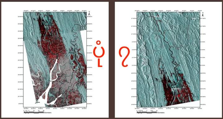 ပုံ ၇။ ၂၁၀၉ ခုနှစ်သြဂုတ် (သို့) စက်တင်ဘာလတွင်ကောင်းကင်ဓာတ်ပုံရိုက်ယူထားပုံ။ ကုလားတန်မြစ် ၏ရေလွမ်းလွှင်ပြင်ကိုမှတွေ့ရသည်။ ကျောက်တော်နှင့်မြောက်ဦးအနောက်ဘက် (၂ဝံ ၅၈’ ၄၁”N) အ တွင်းရှိဧရိယာများတွင်တွေရသည် (အနီရင့်ရောင်သည်ရေလွမ်းမိုးမှုကိုပြသည်)။