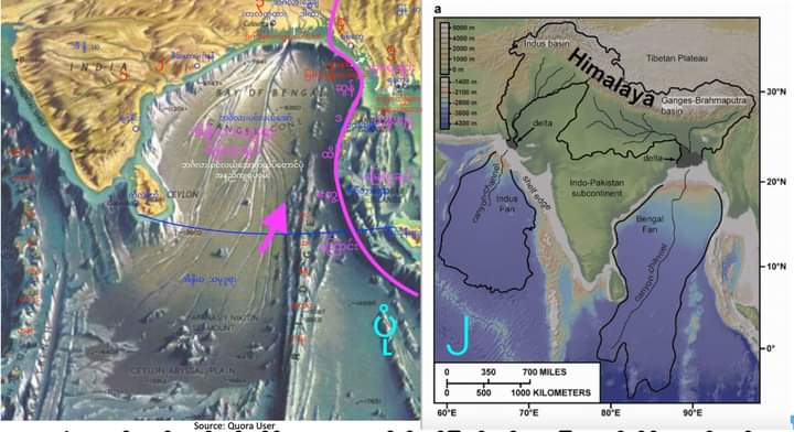 နှစ်သန်း၆၀ (60 million years) မှ ယခုအချိန်ထိ၊ ရေနက်အောက် ယပ်တောင်ပုံ မြစ်၀ ကျွန်းပေါ်အနည်ကျချိုင့်ဝှမ်း Submarine Fan (Abyssal Fan) or Bengal fan (Ganges fan) ဖြစ် တည်နေပြီး၊ ၃၀၀၀ ကီလိုမီတာ (၁၉၀၀ မိုင်) ရှည်ပြီး၊ ၁၄၃၀ ကီလိုမီတာ (၈၉၀ မိုင်) ကျယ်ပြီး၊ ၁၆.၅ ကီလိုမီတာ (၁၀.၃ မိုင်) အထူခန့်အနည်ကျခဲ့သည် (ပုံ ၂)။ ၎င်းသည် အိန္ဒိယ သမုဒ္ဒရာမြေထုချပ် နှင့် ယူရေးရှားကုန်းတွင်းမြေထုချပ်တို့စိုက်ဝင်မှုကြောင့်ဖြစ်ပေါ်လာသော၊ ဟိမဝန္တာတောင်တန်းနှင့်တိဘက် ကုန်းမြေမြင့်တက်မှုနှင့်တိုက်စားမှုတို့ကြောင့် ဖြစ်ပေါ်လာရသည်ဟုဆိုသည် (ပုံ ၂)။