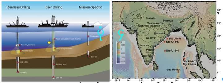 ပုံ ၄။ JOIDES Resolution သဘောၤ (ဘယ်), Chikyu သဘောၤ (လယ်), နှင့် mission-specific platform (အထူးသတ်မှတ်သင်္ဘော သို့မဟုတ် ရေနံတွင်းတူးသဘောၤ) (ဘယ်) နှင့် ဘင်္ဂလားပင်လယ်၊ အရှေ့ဖက်အိန္ဒိကမျးခြေ၊ရှိ Expedition ၃၅၃ project စီမံကိန်း ၏ တွင်းတူးရန်တည်ရှိနေရာ (အနီ ရောင်) (ညာ) ။