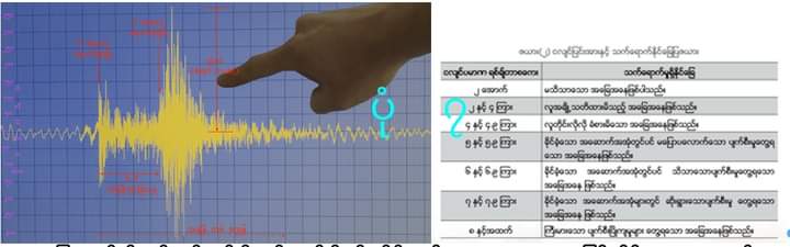 ပုံ ၇။ မြေငလျင်၏လှုပ်ခတ်တုန်ခါမှုကို တုန်ခါနှုန်းတိုင်းစက် (Seismometer) ဖြင့်တိုင်းတာထားသည် ကိုတွေ့ရသည်၊ P waves and S waves ကို ခွဲခြားစွာတွေ့ရသည် (ဘယ်)။ ငလျင်ပြင်းအား (ရစ်ချ်တာ စကေး) နှင့် သက်ရောက်မှုရှိနိုင်ခြေကိုယဉ်တွဲဖေါ်ပြထားသည် (ညာ)။