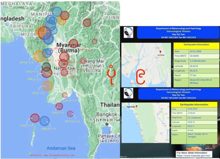ပုံ ၉။ ၂၀၂၀ခုနှစ်အတွင်းမြန်မာနိုင်ငံအတွင်း၊ ဖြစ်ပေါ်သော မြေပြင်ငလျင်ဗဟိုနေရာများ နှင့် ပြင်းအား၊ လှုတ်ခတ်သည့်နေ့များ (www.valcanodiscovery.com) မှကူးယူဖေါ်ပြသည်။ (ဘယ်)၊ မြန်မာနိုင်ငံ၊ မိုးလေဝသနှင့်ဇလဗေဒဦး စီးဌာန၊ နေပြည်တော်တိုင်းတာရေးစခန်းမှတိုင်းတာရရှိမှုရရှိစဉ် (ညာ)။