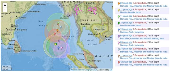 ပုံ ၁၃။ မြေငလျင်ဖြစ်ပေါ်ခဲ့သောနှစ်၊ မြေငလျင်ပြင်းအား နှင့်မြေအောက်ဗဟိုပြုအနက်ပေ၊ အများဆုံး သော ဖြစ်ပေါ်သောကပ္ပလီပင်လယ်ပြင် (National Geographic, 2020 မှကူးယူဖေါ်ပြသည်)။