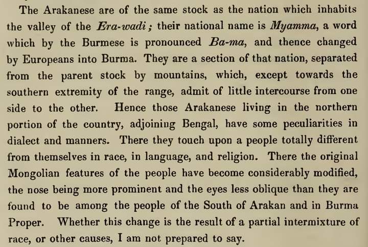 ၅. Adamson (1887) ရခိုင်သား က ဗမာ နဲ့ လူမျိုးတူပြီး၊ သူတို့က မြန်မာမိသားစု က အရင်ဆင်းသက် လာသူတွေ ဖြစ်တယ်လို့ ပြောပြပါတယ်။ Arakanese are of Burman stock and claim to be descended from the elder branch of Mramma family.