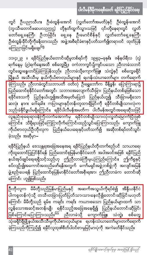 ၃. ၁၉၄၈ ဖွဲ့စည်းပုံ − အမတ် ဗမာ ၅၃၊ ရှမ်း ၂၅၊ ကရင် ၂၄၊ ကချင် ၁၂၊ ချင်း ၈၊ ကယား ၃ နေရာ။ ရခိုင် က ဗမာ ၅၃ ထဲက ၅ နေရာ။
