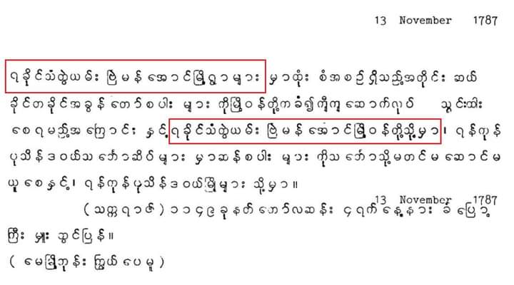 ၂. ဓညဝတီ အရေးတော်ပုံကျမ်း ၁၇၈၇ မှာ − ရခိုင်စကားပြောသူတွေကို (မရမာ) လို့ ဖေါ်ပြခဲ့ပါတယ်။