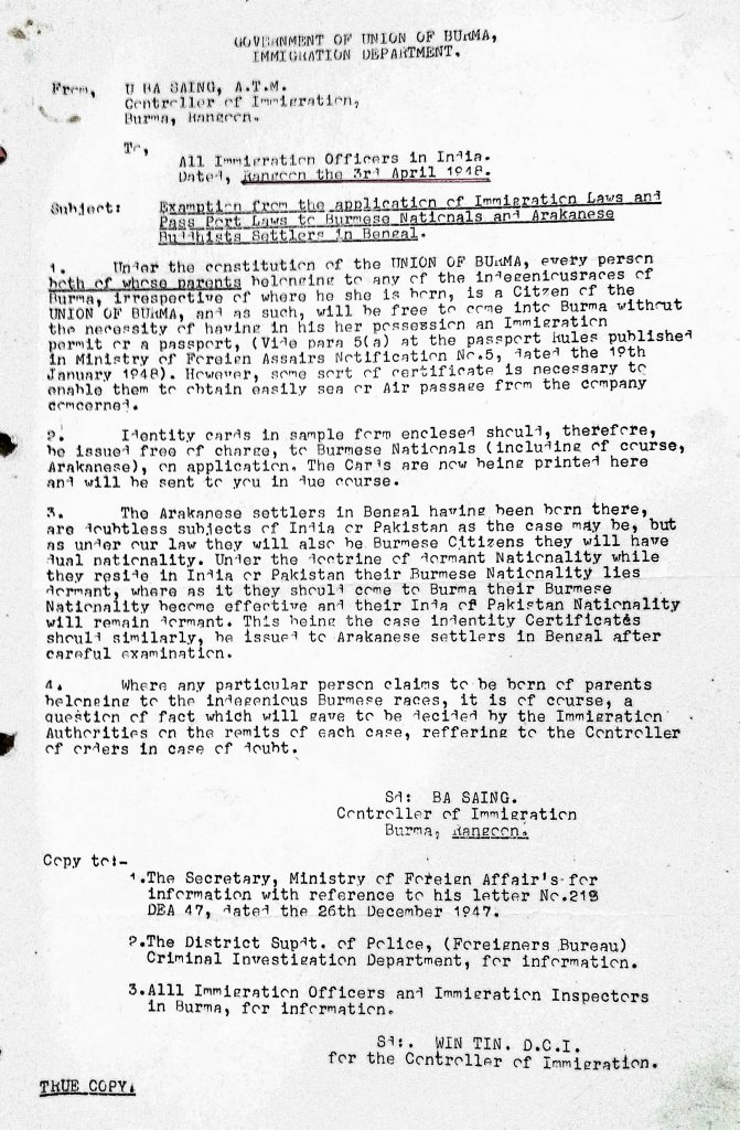 subject: “Exemption from the application of Immigration Laws and Passport Laws to Burmese Nationals and Arakanese Buddhists Settlers in Bengal”