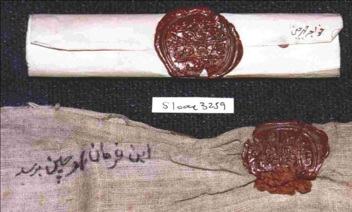 Written reminders of seventeenth century trade between Arakan and the Coromandel coast: Top: a letter from king Candasudhammaraja to the Armenian merchant Jeorge Christiano in Chennai in Persian with its original envelope and seal in Arakanese, dated 20 September 1679. The seal reads: raja dhippati rhwe nan sa khan, or