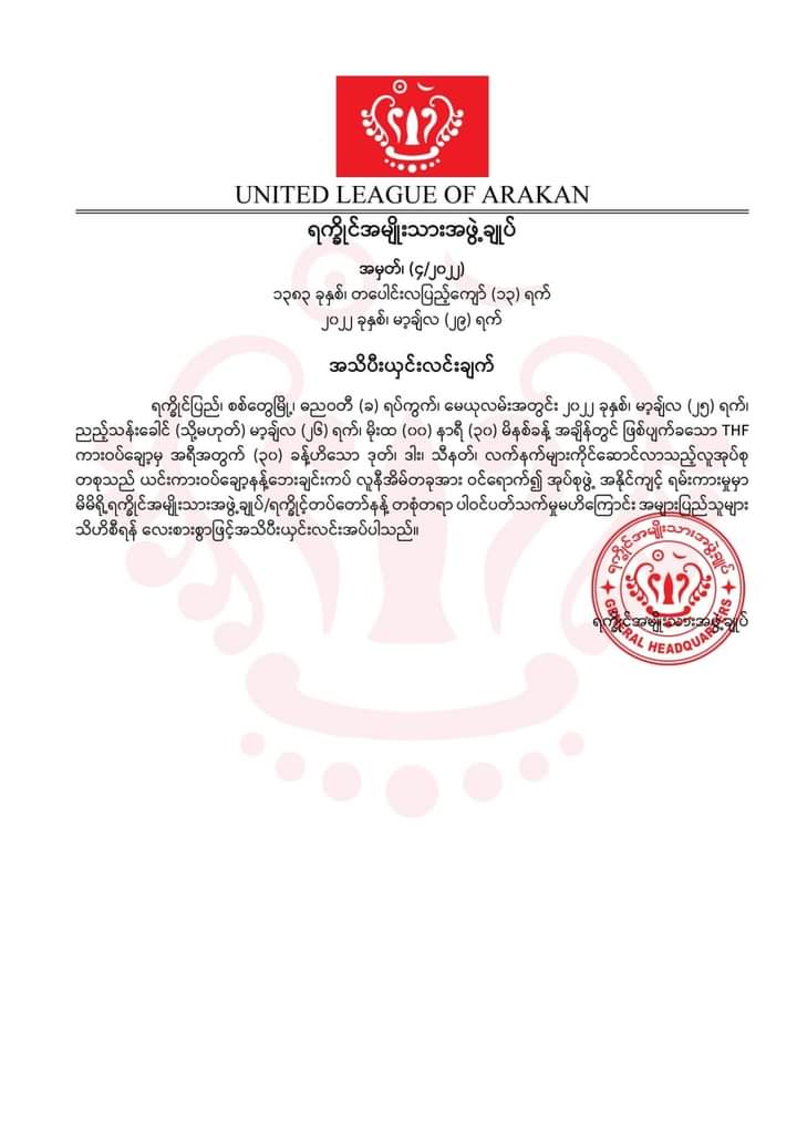 ရက္ခိုင်ပြည်၊ စစ်တွေမြို၊ ဓညဝတီ (ခ) ရပ်ကွက်၊ မေယုလမ်းအတွင်း ၂၀၂၂ ခုနှစ်၊ မာ့ချ်လ (၂၅) ရက်၊ ညည့်သန်းခေါင် (သိုမဟုတ်) မာ့ချ်လ (၂၆) ရက်၊ မိုးထ (၀၀) နာရီ (၃၀) မိနစ်ခန့် အချိန်တွင် ဖြစ်ပျက်ခသော THF ကားဝပ်ချော့မှ အရီအတွက် (၃၀) ခန့်ဟိသော ဒုတ်၊ ဒါး၊ သီနတ်၊ လက်နက်များကိုင်ဆောင်လာသည့်လူအုပ်စု တစုသည် ယင်းကားဝပ်ချော့နန့်ဘေးချင်းကပ် လူနီအိမ်တခုအား ဝင်ရောက်၍ အုပ်စုဖွဲ့ အနိုင်ကျင့် ရမ်းကားမှုမှာ မိမိရို့ရက္ခိုင်အမျိုးသားအဖွဲ့ချုပ်/ရက္ခိုင့်တပ်တော်နန့် တစုံတရာ ပါဝင်ပတ်သက်မှုမဟိကြောင်း အများပြည်သူများ သိဟိစီရန် လေးစားစွာဖြင့်အသိပီးယှင်းလင်းအပ်ပါသည်။