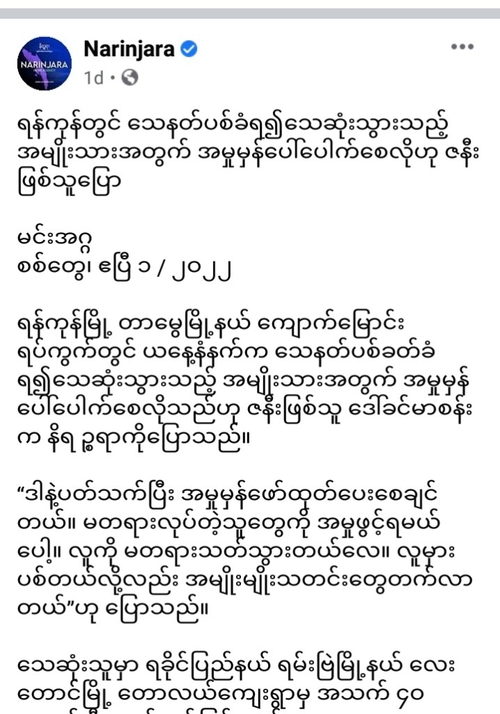 - ” ရန်ကုန်တွင် သေနတ်ပစ်ခံရ၍သေဆုံးသွားသည့်အမျိုးသားအတွက် အမှုမှန်ပေါ်ပေါက်စေလိုဟု ဇနီးဖြစ်သူပြော ” | Narinjara