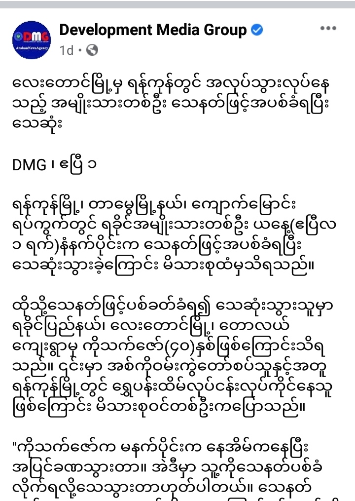 ” လေးတောင်မြို့မှ ရန်ကုန်တွင် အလုပ်သွားလုပ်နေသည့် အမျိုးသားတစ်ဦး သေနတ်ဖြင့်အပစ်ခံရပြီးသေဆုံး ” | Development Media Group | on Facebook / on website