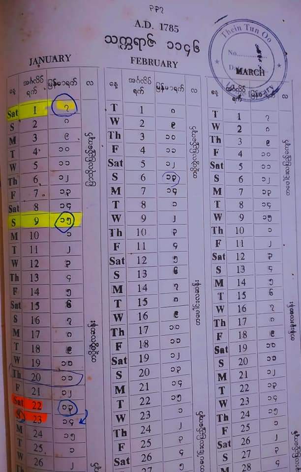 ခုနုစ်တွင်မြန်မာနေ့ရက်ကိုအဂ်လိပ်ခုလရက်နေ့အလွယ်သိအောင်မြန်မာလက်ချိုးပြက္ခဒိန်ပုံနှိပ်ဖြန့်ဝေခဲ့ကြသည်။