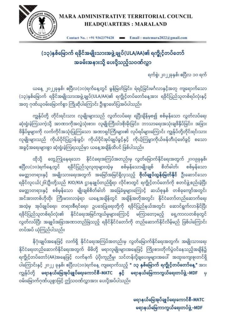 April 10, 2022April 10, 2022 tmnwiki မရာနယ်မြေအုပ်ချုပ်ရေးကောင်စီ (MATC)/မရာနယ်မြေကာကွယ်ရေးတပ် (MDF) မှ ၁၃ နှစ်မြောက် ရက္ခိုင့်တပ်တော် တည်ထောင်သည့်နေ့ အခမ်းအနားသို့ ပေးပို့သော သဝဏ်လွှာ (The Mog Nation Wiki, an archive) End Notes and External links – Tag: Chin Arakan-related Books and Documents / ရခိုင်ရေးရာ စာအုပ်စာတမ်းများ Facebook Twitter Telegram YouTube Instagram LinkedIn WordPress The Mog Nation Wiki The Mog Nation WikiThe Mog Nation Wiki | fandom Kyaw Zaw Oo Kyaw Zaw Oo’s BlogKyaw Zaw Oo | Facebookကျော်ဇောဦး | FacebookKyaw Zaw Oo | Twitter Share this: Click to share on X (Opens in new window) X Click to share on Facebook (Opens in new window) Facebook Like Loading... Related