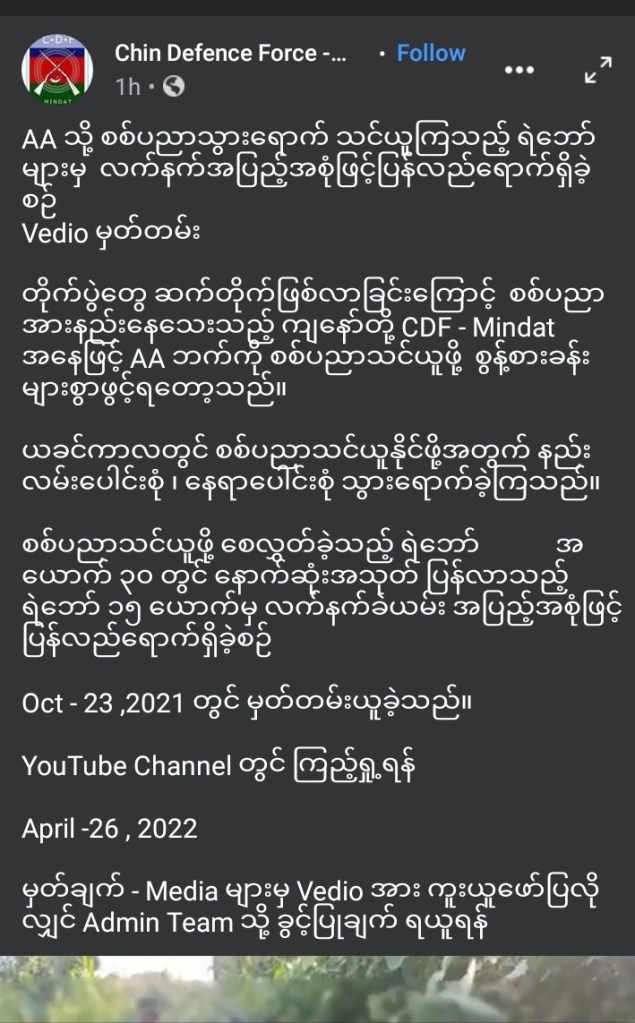 တိုက်ပွဲတွေ ဆက်တိုက်ဖြစ်လာခြင်းကြောင့် စစ်ပညာအားနည်းနေသေးသည့် ကျနော်တို့ CDF – Mindat အနေဖြင့် AA ဘက်ကို စစ်ပညာသင်ယူဖို့ စွန့်စားခန်းများစွာဖွင့်ရတော့သည်။
