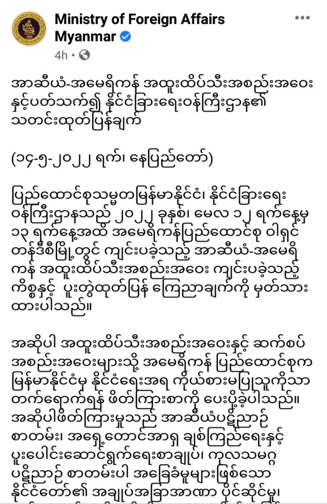 ထို့အပြင် မြန်မာနိုင်ငံမှ အကြမ်းဖက်အဖွဲ့များနှင့် တရားမဝင်အသင်းအဖွဲ့များအဖြစ် ကြေညာထားသည့် အဖွဲ့အစည်းများ၊ အထူးသဖြင့် အမျိုးသားညီညွတ်ရေးအစိုးရဆိုသည့် NUG နှင့် ယင်းတို့၏ လက်အောက်ခံအဖွဲ့အစည်းများမှ ကိုယ်စားလှယ်ဆိုသူများနှင့် အမေရိကန်နိုင်ငံ ခြားရေးဝန်ကြီးဌာနမှ တာဝန်ရှိသူများ ဝါရှင်တန်၌ တွေ့ဆုံခဲ့ခြင်းအပေါ် နိုင်ငံခြားရေး ဝန်ကြီးဌာနက ပြင်းထန်စွာ ကန့်ကွက်သည်။