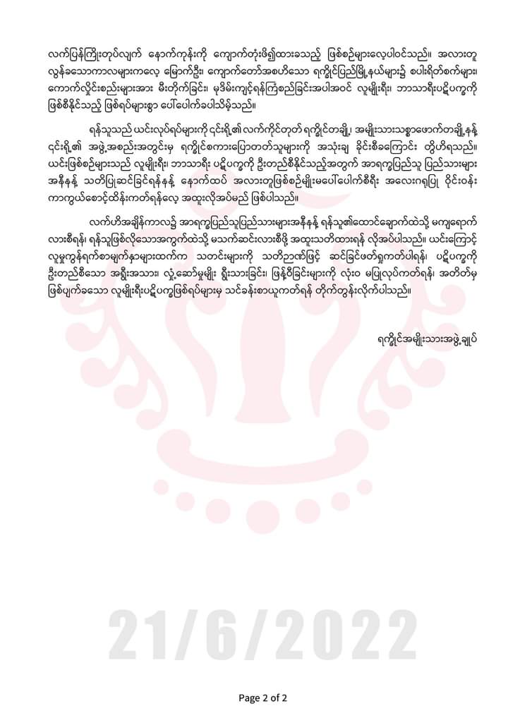 လက်ဟိအချိန်ကာလ၌ အာရက္ခပြည်သူပြည်သားများအနီနန့် ရန်သူ၏ထောင်ချောက်ထဲသို့ မကျရောက် လားစီရန်၊ ရန်သူဖြစ်လိုသောအကွက်ထဲသို့ မသက်ဆင်းလားစီဖို့ အထူးသတိထားရန် လိုအပ်ပါသည်။ ယင်းကြောင့် လူမှုကွန်ရက်စာမျက်နှာများထက်က သတင်းများကို သတိဉာဏ်ဖြင့် ဆင်ခြင်ဖတ်ရှုကတ်ပါရန်၊ ပဋိပက္ခကို ဦးတည်စီသော အရွီးအသား၊ လှုံ့ဆော်မှုမျိုး ရွီးသားခြင်း၊ ဖြန့်ဝီခြင်းများကို လုံးဝ မပြုလုပ်ကတ်ရန်၊ အတိတ်မှ ဖြစ်ပျက်ခသော လူမျိုးရီးပဋိပက္ခဖြစ်ရပ်များမှ သင်ခန်းစာယူကတ်ရန် တိုက်တွန်းလိုက်ပါသည်။