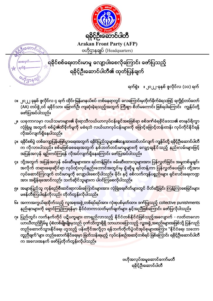 ရခိုင်စစ်ရေးတင်းမာမှု လျော့ပါးစေလိုကြောင်း ဖော်ပြသည့် ရခိုင့်ဦးဆောင်ပါတီ၏ ထုတ်ပြန်ချက်