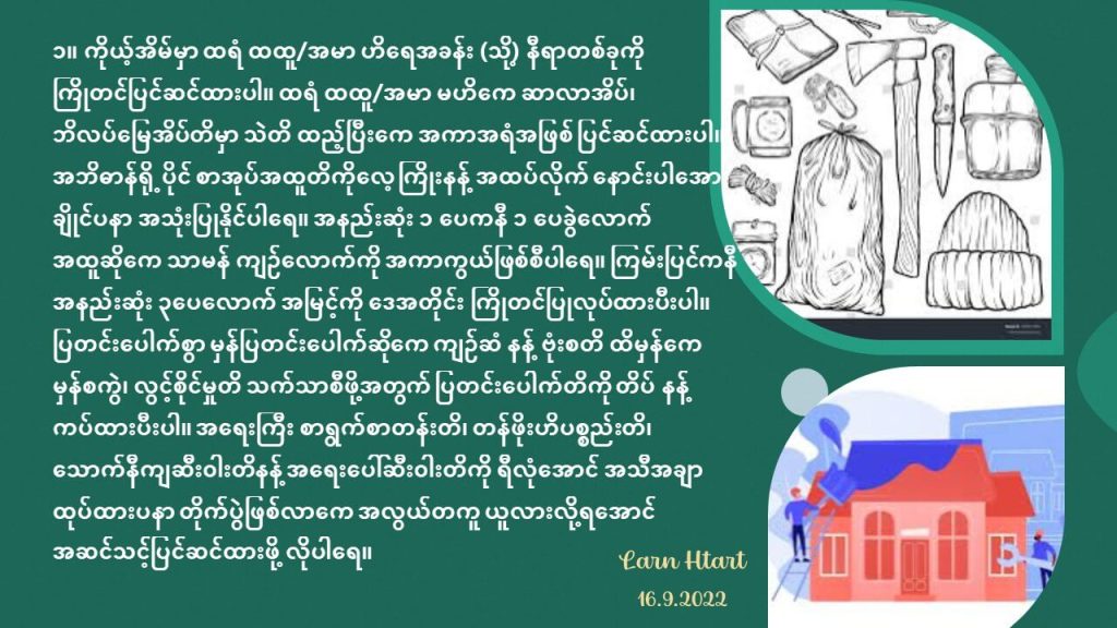 ၁။ နီထိုင်ရေအိမ်ကို လုံခြုံအောင် ပြင်ဆင်ထားပနာ အရေးတကြီးလိုအပ်စွာတိ၊ အရေးကြီးစာရွက်စာတမ်းတိကို အဆင်သင့်ပြင်ထားပါ။
