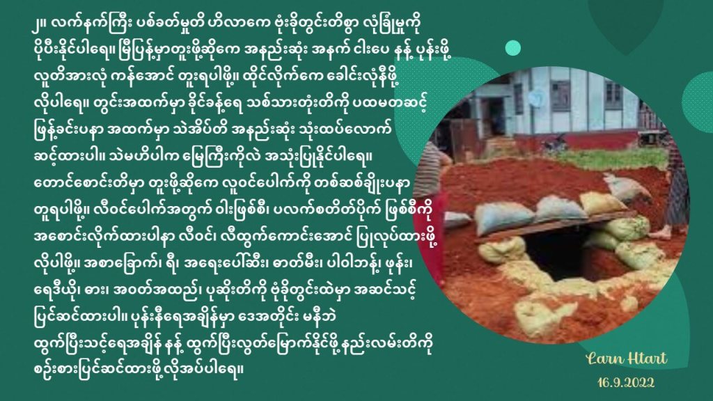 ၂။ လက်နက်ကြီး ပစ်ခတ်မှုတိ ဟိလာကေ ဗုံးခိုတွင်းတိစွာ လုံခြုံမှုကို ပိုပီးနိုင်ပါရေ။ မြီပြန့်မှာ တူးဖို့ဆိုကေ အနည်းဆုံးအနက် ငါးပေနန့် ပုန်းဖို့လူတိအားလုံးကန်အောင် တူးရပါဖို့။ ထိုင်လိုက်ကေ ခေါင်းလုံနီဖို့လိုပါရေ။ တွင်းအထက်မှာ ခိုင်ခန့်ရေ သစ်သားတုံးတိကို ပထမတဆင့် ဖြန့်ခင်းပနာ အထက်မှာ သဲအိပ်တိ အနည်းဆုံး သုံးထပ်လောက် ဆင့်ထားပါ။ သဲမဟိပါက မြေကြီးကိုလဲ အသုံးပြုနိုင်ပါရေ။ တောင်စောင်းတိမှာ တူးဖို့ဆိုကေ လူဝင်ပေါက်ကို တစ်ဆစ်ချိုးပနာ တူးရပါဖို့။ လီဝင်ပေါက်ကို ဝါးဖြစ်စီ၊ ပလက်စတိတ်ပိုက်ဖြစ်စီကို အစောင်းလိုက်ထားပါနာ လီဝင်လီထွက်ကောင်းအောင် ပြုလုပ်ထားဖို့လိုပါဖို့။ အစာခြောက်၊ ရီ၊ အရီးပေါ်ဆီး၊ ဓါတ်မီး၊ ပါဝါဘန့်၊ ဖုန်း၊ ရေဒီယို၊ ဓါး၊ အဝတ်အထည်၊ ပုဆိုးတိကို ဗုံးခိုကျင်းထဲမှာ အဆင်သင့်ပြင်ဆင်ထားပါ။ ပုန်းနီရေအချိန်မှာ ဒေအတိုင်းမနီဘဲ ထွက်ပြီးသင့်ရေအချိန်နန့် ထွက်ပြီးလွတ်မြောက်နိုင်ဖို့ နည်းလမ်းတိကို စိုင်းစားပြင်ဆင်ထားဖို့ လိုအပ်ပါရေ။