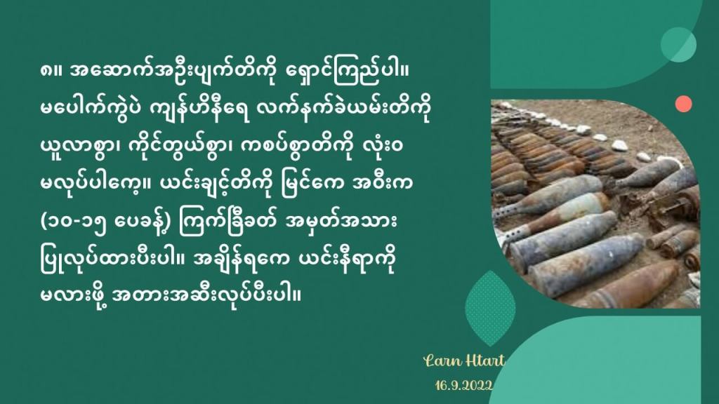 ၈။ အဆောက်အဦးပျက်တိကို ရှောင်ကြည်ပါ။ မပေါက်ကွဲဘဲ ကျန်ဟိနီရေ လက်နက်ခဲယမ်းတိကို ယူလာစွာ၊ ကိုင်တွယ်စွာ ကဇတ်စွာတိကို လုံးဝမလုပ်ပါကေ့။ ယင်းချင့်တိကိုမြင်ကေ အဝီးက (၁၀-၁၅ ပေခန့်) ကြက်ခြီခတ်အမှတ်အသား ပြုလုပ်ထားပီးပါ။ အချိန်ရကေ ယင်းနီရာကို မလားဖို့ အတားအဆီးလုပ်ပီးပါ။