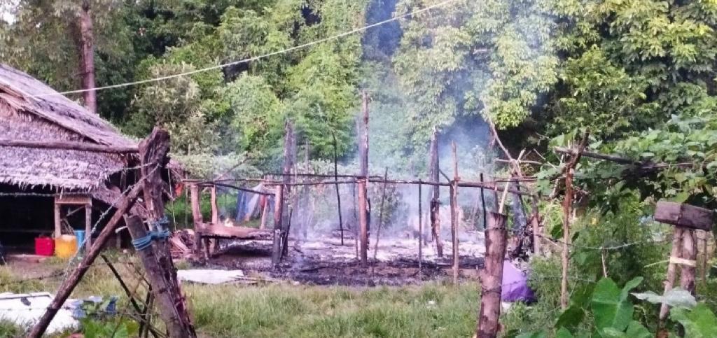 ပုံစာ – မောင်တောမြို့နယ်၊ ဖားဝပ်ချောင်းကျေးရွာမှ မီးရှို့ခံခဲ့ရသည့်နေအိမ်တစ်ဆောင်ကို တွေ့ရစဉ်။
