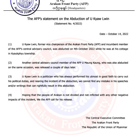 ရခိုင်စစ်ရေးတင်းမာမှု လျော့ပါးစေလိုကြောင်း ဖော်ပြသည့် ရခိုင့်ဦးဆောင်ပါတီ၏ ထုတ်ပြန်ချက်